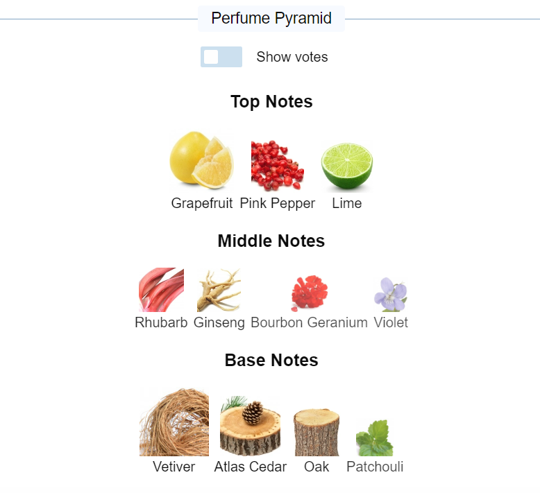 Hương cuối : Cỏ hương bài, Gỗ tuyết tùng Satin, Cây sồi và Cây hoắc hương.