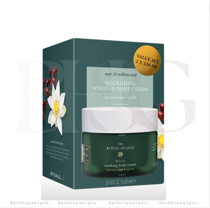 - Kem dưỡng thể Ritual of Jing chứa các đặc tính thư giãn và nuôi dưỡng của hoa sen và tác dụng làm dịu của táo tàu. Bộ quà tặng tuyệt vời này bao gồm một loại kem dưỡng thể cỡ lớn và một lần nạp lại, đảm bảo bạn có thể tiếp tục tạo ra trạng thái tinh thần thoải mái và truyền cho bạn cảm giác yên bình và bình yên trong ngày.