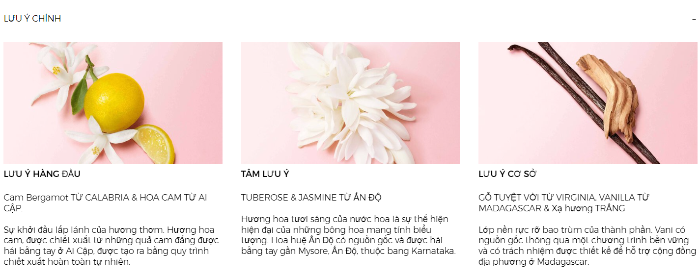 • Hương thơm thanh lịch lấy từ ba thành phần chính từ khắp nơi trên thế giới: hoa cam được chiết xuất từ những quả cam đắng được hái bằng tay ở Ai Cập; hoa huệ Ấn Độ có nguồn gốc và được hái cẩn thận gần Mysore, Ấn Độ; và vani có nguồn gốc thông qua một chương trình có trách nhiệm được thiết kế để hỗ trợ cộng đồng địa phương ở Madagascar.
